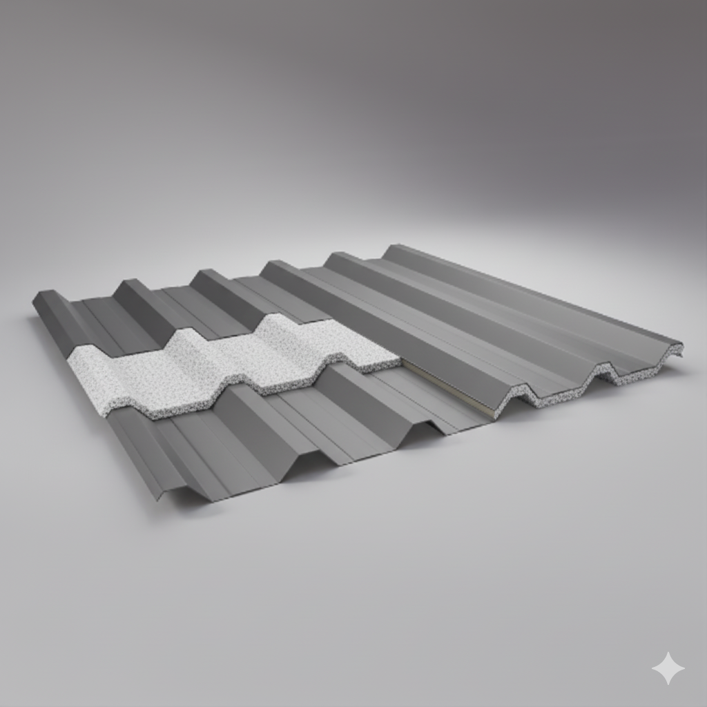 Telha sanduíche com núcleo em EPS (isopor), proporcionando ótimo custo-benefício e excelente isolamento térmico. Perfeita para galpões comerciais, residências e construções em geral.